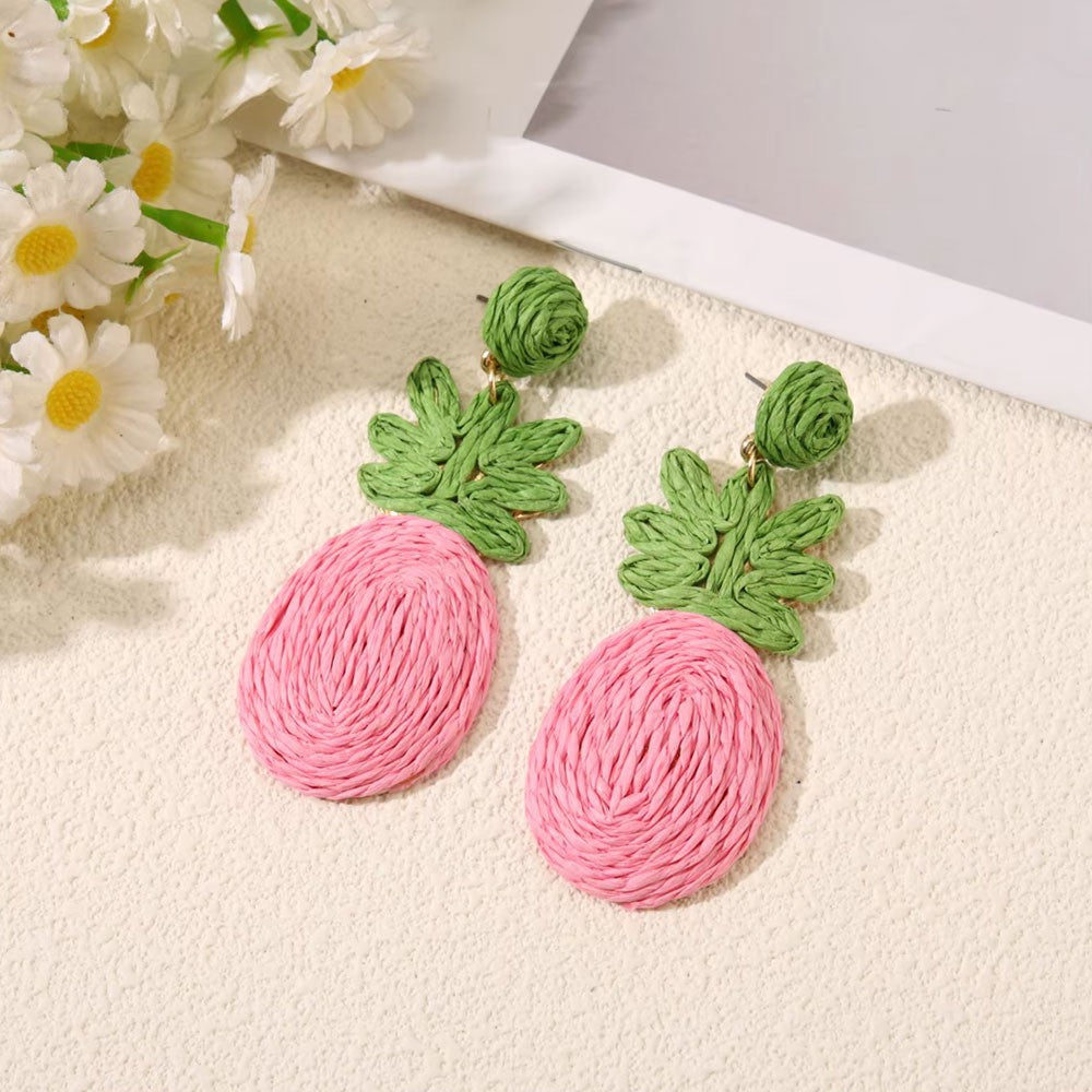 Bohemian Fashion Rattan Braid Flower & Pineapple Shaped Pendant Earrings Handmade Straw Raffia Woven